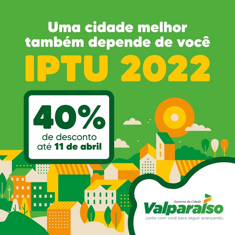 Prazo para pagamento à vista vai até o dia 11 de abril O IPTU 2022 terá o desconto de 40% para pagamento à vista até o dia 11 de abril. A guia de pagamento pode ser acessada através do link clique aqu...