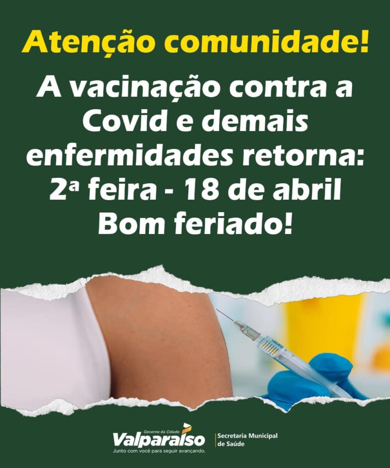 A Secretaria Municipal de Saúde informa que a aplicação de vacinas contra Covid-19 e demais enfermidades, retornará na próxima segunda-feira (18/04). O órgão fica localizado na Rua 06, Quadra 07, Lote...